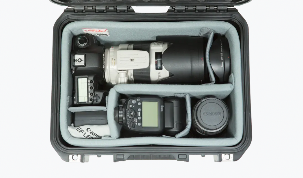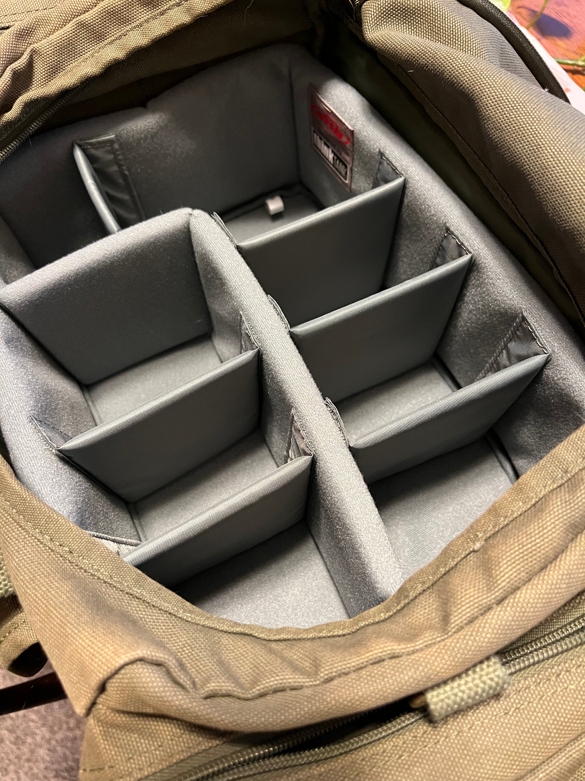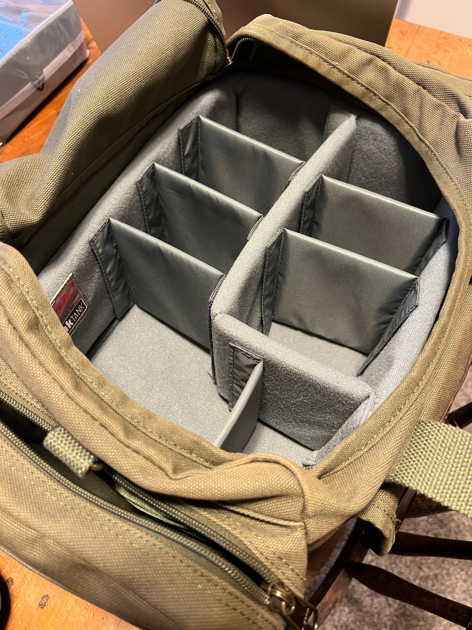 This is the iSeries 1309-6 Think Tank Designed Divider Set, made for the SKB iSeries case but fits perfectly in the Guitar Satchel Bus Bag to convert your duffle bag into an inconspicuous camera bag. Big enough to hold two DSLR or mirrorless camera bodies and 4-5 prime lenses or one body with a 70-200 lens, another zoom and accessories. This set up reminds me of the classic canvas case all photojournalists (including myself) used into the late 1990's.